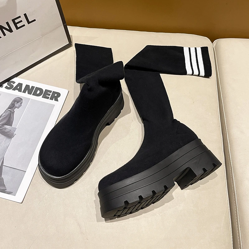 Women Flats Shoes Platform Knitting Chelsea Over The Knee Boots